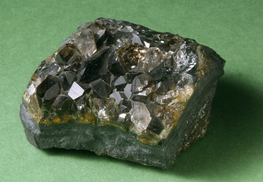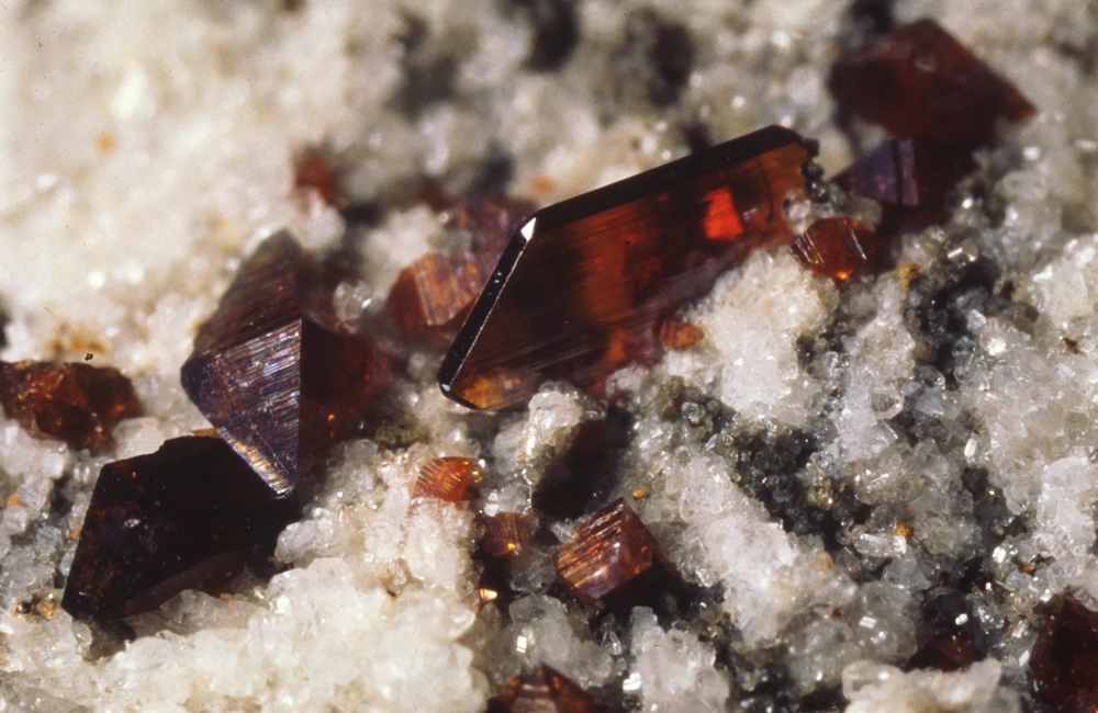 Alpine-Fissure-type veins are common in the deformed Lower Palaeozoic rocks of North Wales. Some very fine crystallized mineral specimens are known from these veins: apart from the dominant mineral, quartz, these include albite, clinozoisite, anatase, brookite, synchysite, monazite, xenotime, axinite and various sulphides. The brookite crystals formerly obtained from the now closed locality of Prenteg, near Tremadog in Snowdonia, are among the world’s finest examples of the mineral.