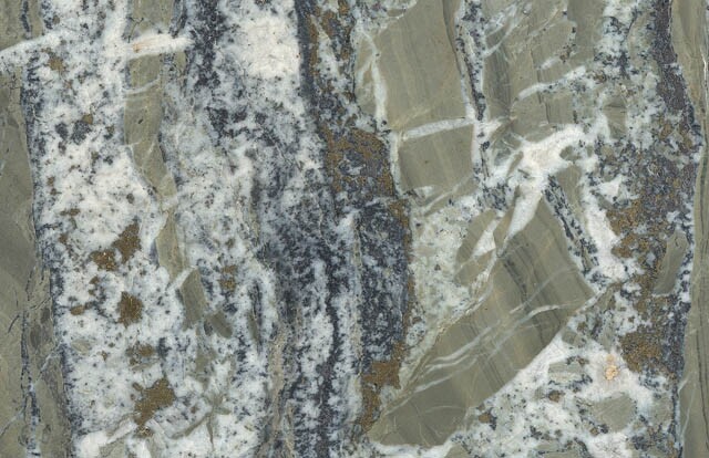 Alpine Fissure-type veins are localized mineral deposits hosted by competent (hard) lithologies, such as tuff or sandstone beds, igneous sills and dykes. They are particularly conspicuous where such rock units occur within deformed sequences of less competent (soft) rocks such as mudstones, and are formed as a consequence of the response of the competent rocks to the immense compressive forces that prevail during the deformation. During deformation, incompetent rocks are literally squashed, often into complex folds: however, a competent bed cannot accommodate the stress in this way and instead it fractures repeatedly due to its inherent brittleness. Alpine Fissure-type veins are the mineralized infillings of the fractures.