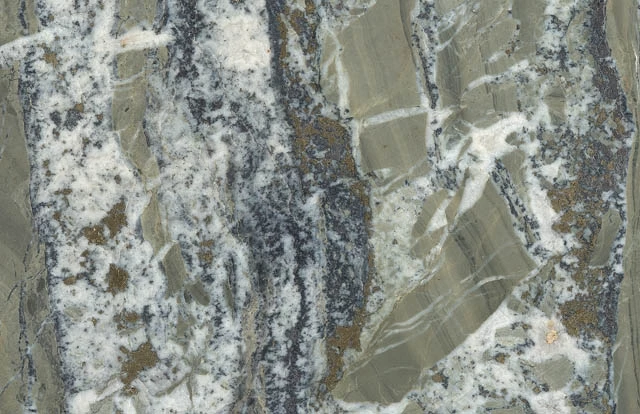 - Metamorphism: When thick sequences of sedimentary and volcanic rocks are buried to greater and greater depths they are subjected to increasing pressures and temperatures, resulting in low-grade metamorphism. This liberates significant amounts of water from hydrated minerals, such as clays, as they recrystallize. This water can then migrate as a hydrothermal fluid along suitable pathways through the rocks, such as faults and shear-zones, where minerals are deposited. Some of the best Welsh examples of such veins are those in the Dolgellau Gold-belt, hosted by Middle to Upper Cambrian sedimentary rocks and intrusions, and formed prior to the Caledonian deformation that uplifted the Welsh Basin in Devonian times. The veins occupy fault-fractures with strike lengths of several kilometres and typically reveal ribbonlike textures as in the example illustrated above. Metamorphic reactions causing widescale dewatering of deeply-buried rocks is believed to have been the mechanism which generated the hydrothermal fluids.