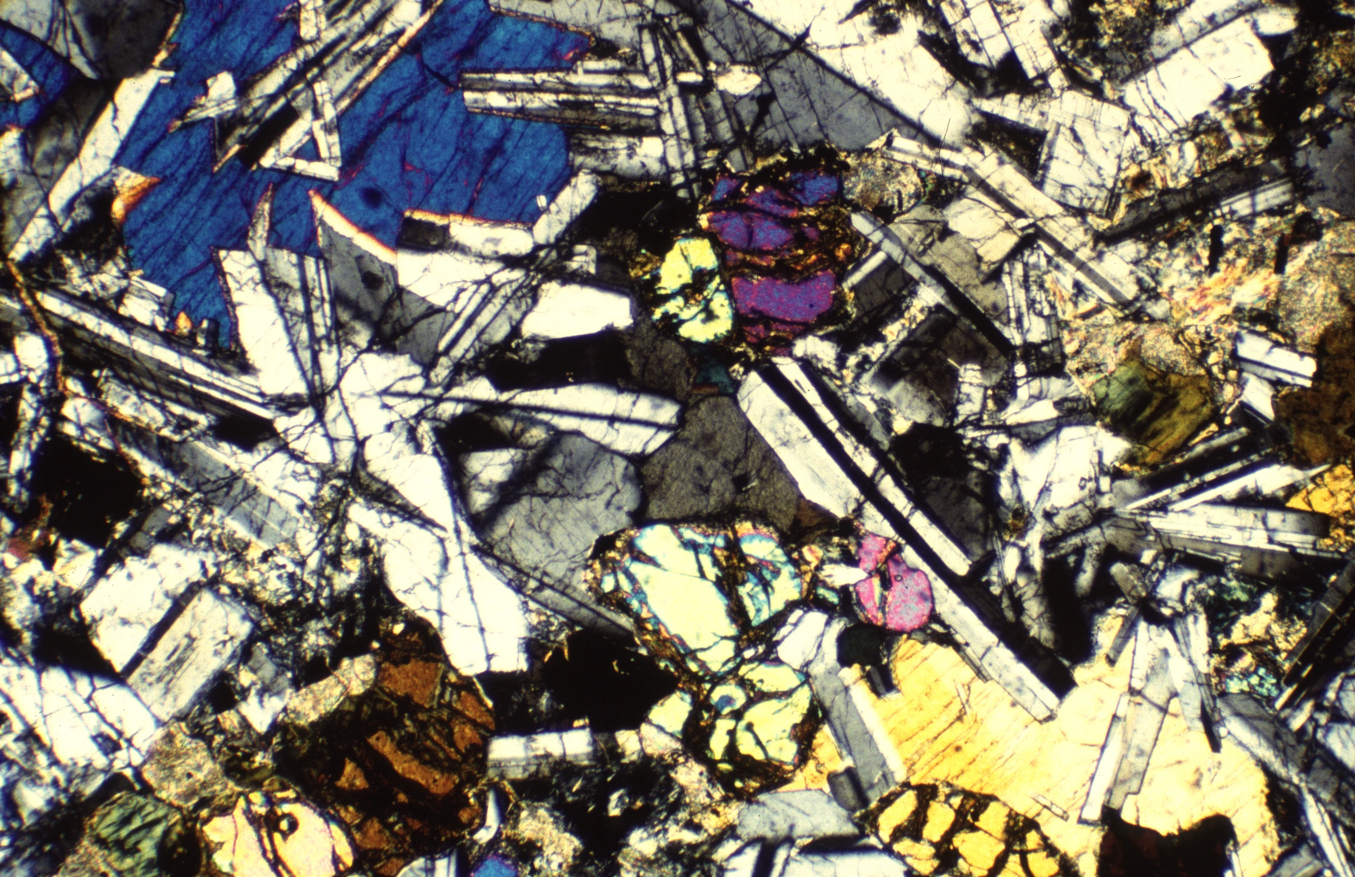 Igneous rocks that form by a gradual cooling process tend to contain larger crystals whilst relatively fast cooling of magma results in much smaller crystals, as they do not have so much time to grow. Large masses of magma that do not reach the Earth’s surface but cool and crystallize at depth are know as plutons. When eventually exposed at the surface they are typically several kilometres across. It has been calculated that plutons take tens of thousands to millions of years to cool depending on their size and the depth at which they solidify. It has also been calculated that plutons containing large feldspar crystals, several centimetres across, these crystals may take tens to hundreds of thousands of years to grow.