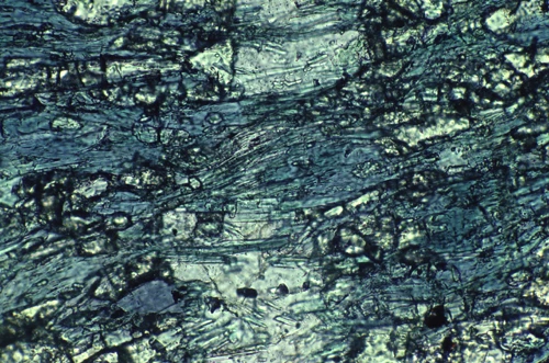 Some of the most unusual metamorphic rocks in Wales are blueschists exposed in southern Anglesey. These rocks are rich in the blue amphibole (glaucophane/ferroglaucophane) and formed under similar low temperatures to greenschists (300-400°C) but at far greater depths (up to 30 km). They are interpreted as having formed in a subduction zone in very latest Precambrian times, around 550-560 million years ago.